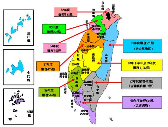 內政部土地測量局(89~92年):台灣省控制點補建、新建後續計畫;包括彰化縣、雲林縣、嘉義縣(東半部)、高雄市、高雄縣西半部、 澎湖縣、屏東縣西半部、台東縣、花蓮縣、宜蘭縣及福建省金門縣、連江縣等地區。 |